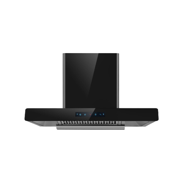 Experience the ultimate in compact kitchen ventilation with the T-24 T-Shape Hood, featuring a sleek black design, advanced hand sensor with touch panel, and powerful heavy copper motor.